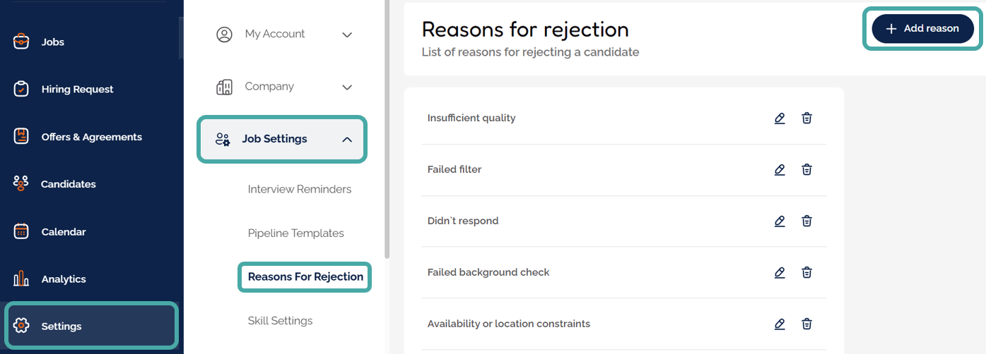 When declining a candidate, you will choose a reason for declining. First of all, you will need to create your reasons for rejection within your Job Settings area.
