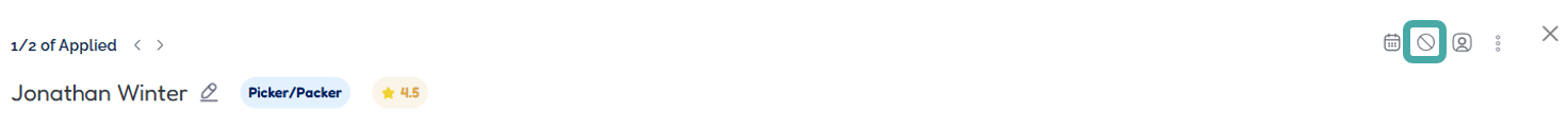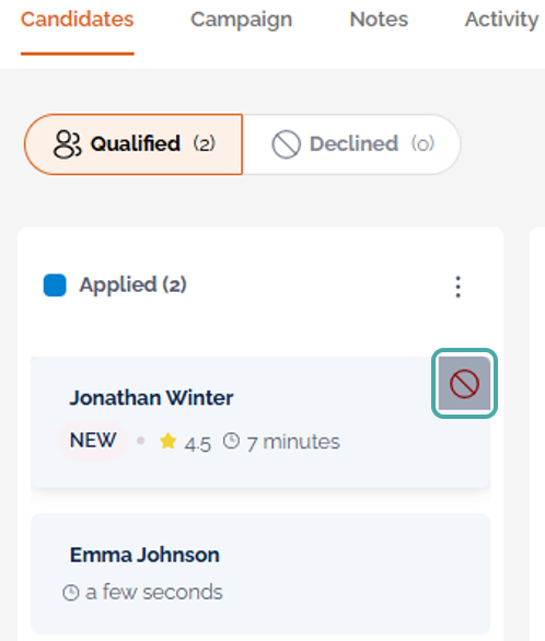 - From the Candidates section of a job - when hovering over the candidate, the decline button will appear.