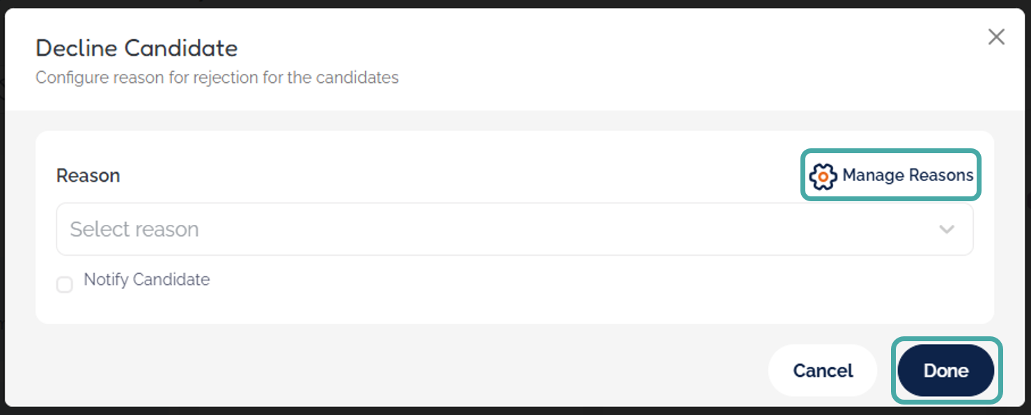 - After declining a candidate, a window will appear where you can choose your rejection reason from a dropdown menu. Reasons can be added by clicking the Manage Reasons button.