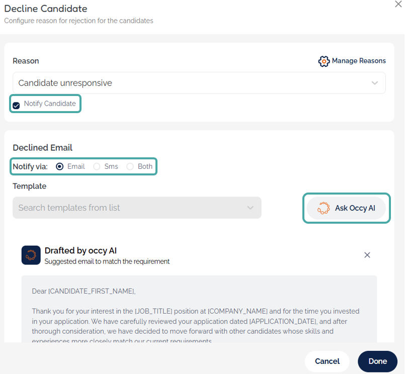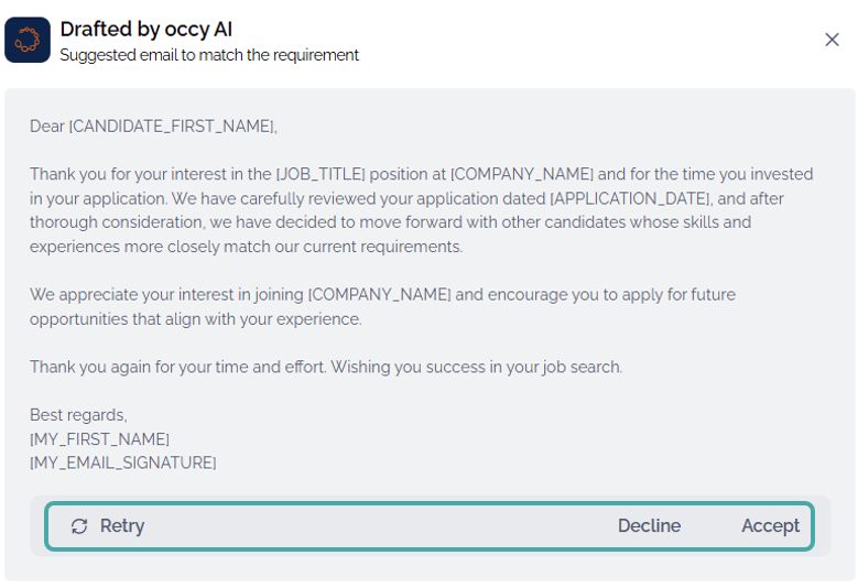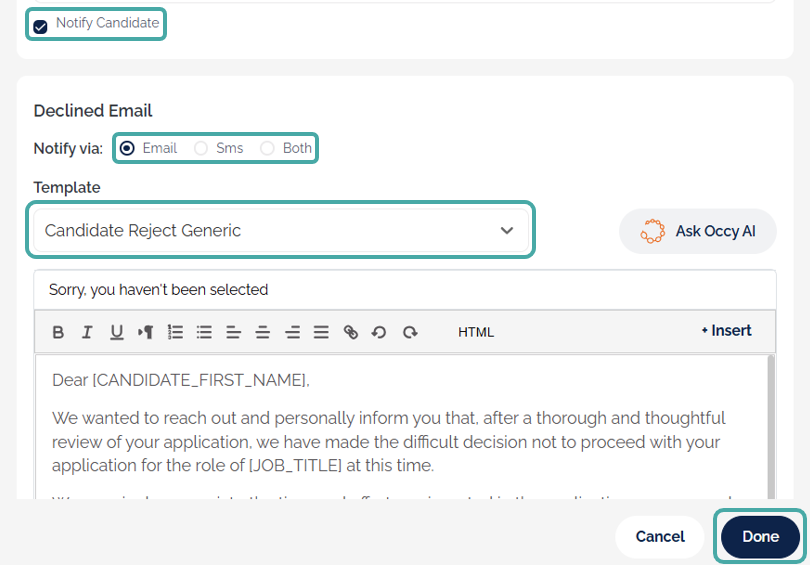 What's more, you can use occy AI to create personalised email and SMS messages to use if you choose to notify candidates when declining their application.