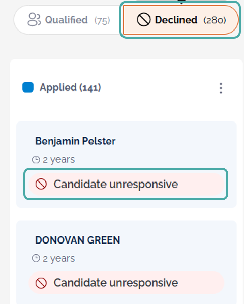 Declined candidates appear in the Declined tab of the Candidates tab within a job. The reason for rejection will be listed under the candidate's name.