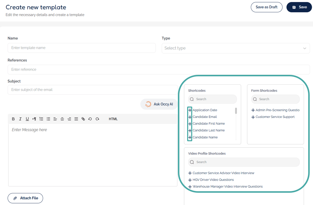 Shortcodes are used to include candidate-specific details, such as names, addresses, and job titles in your email and SMS communications without having to manually add the information. Simply add the shortcode to your messages, and the information will populate when sent to candidates, allowing you to send personalised messages to multiple candidates simultaneously.