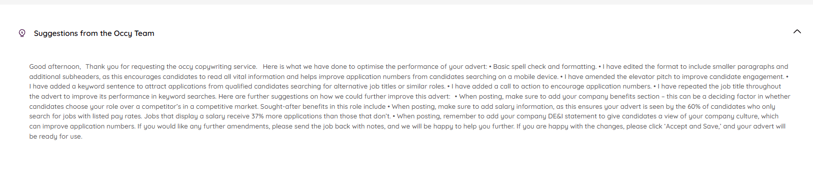 - If you are happy with the copywritten version of the advert, click Accept & Save, and the process will be completed.