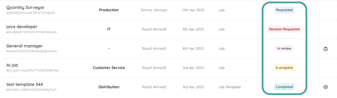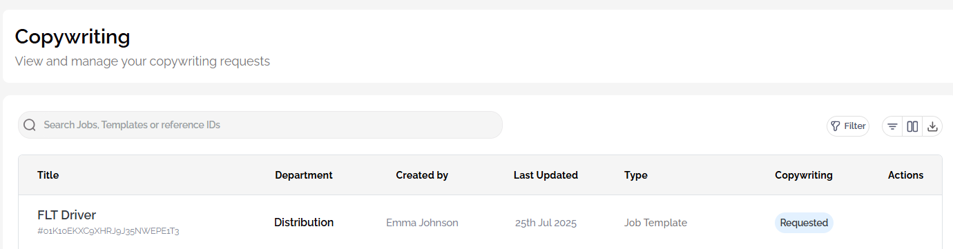Once copywriting has been requested, the template or job advert can be found in the Copywriting section in the Settings area. From here, you can review the status of your request.