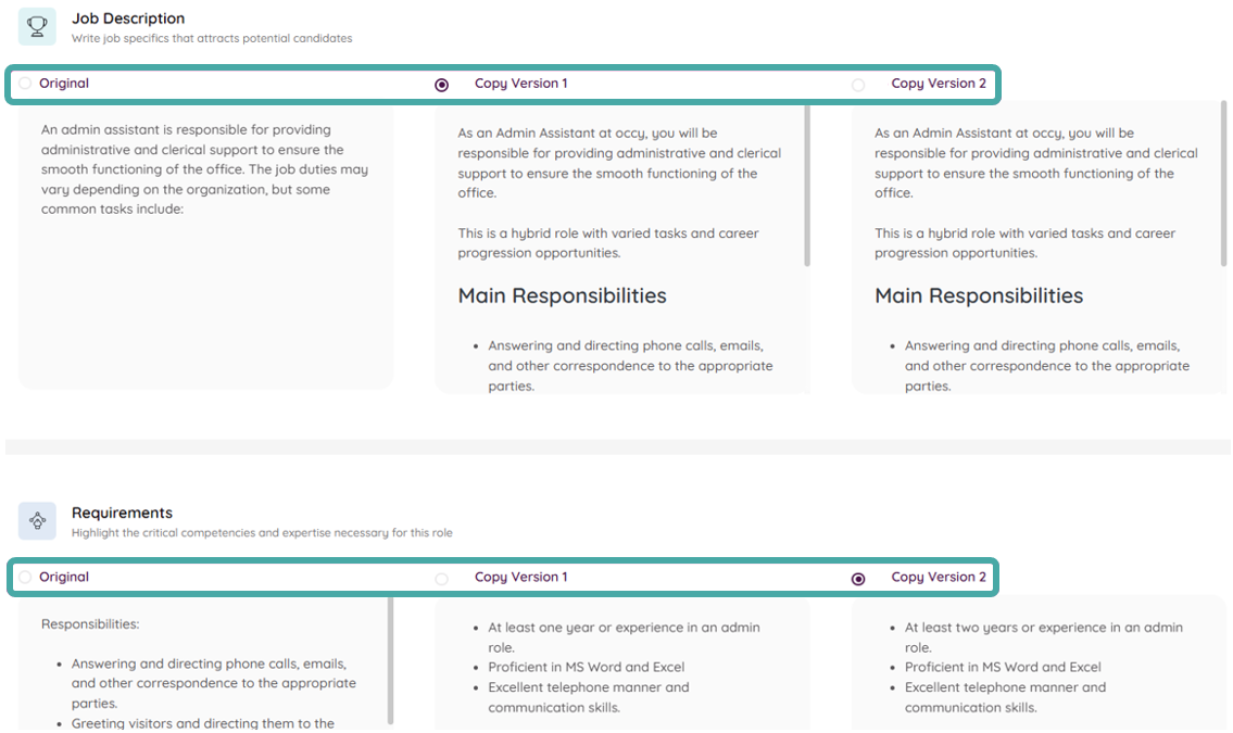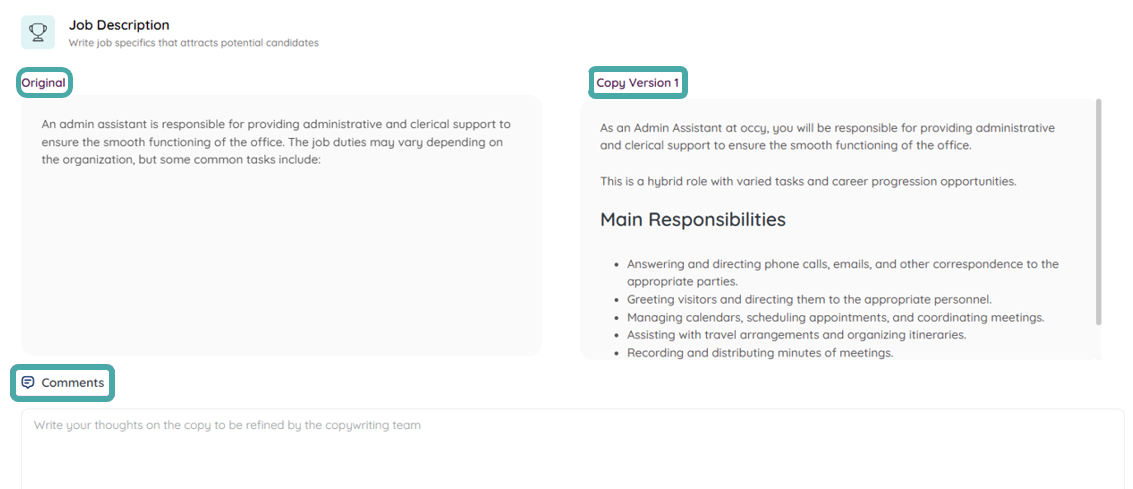 To allow you to easily compare the original and copywritten versions, they will be displayed side-by-side in the same format that the template or advert was created, with three separate sections - Elevator Pitch, Job Description, and Requirements.