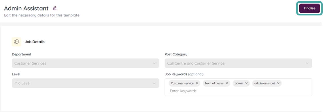 - Then, click Finalise to accept and save the job/job template. The copywriting entry will now change from In review to Completed, and the job or job template is now available to use.