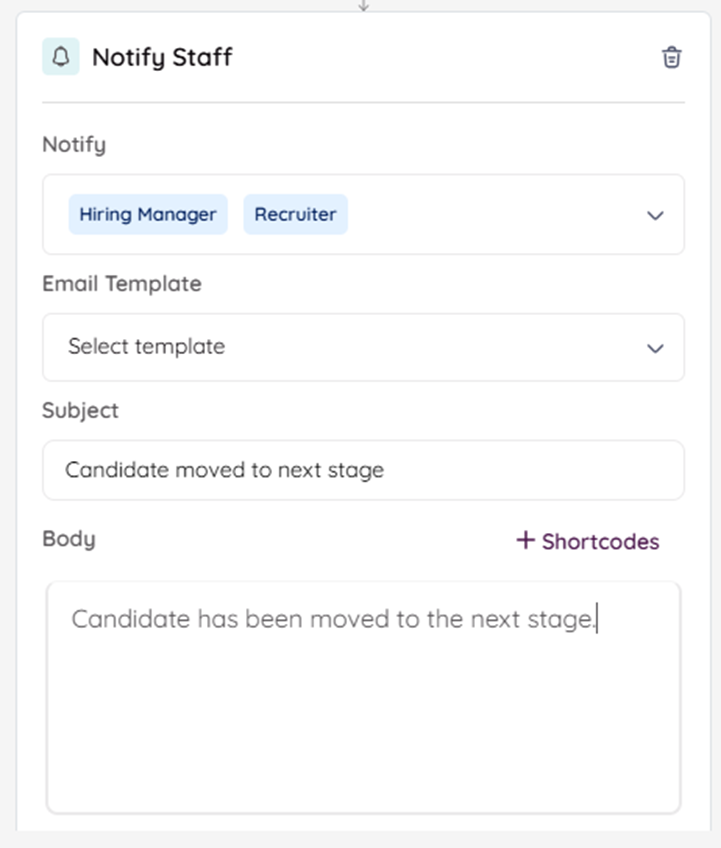 The Notify Staff feature simplifies the process of sending emails to your colleagues when important events occur. For instance, if a candidate advances to a specific stage in the hiring process, this tool allows you to promptly inform your team members about this. It's a convenient and efficient way to keep everyone in the loop and ensure effective communication within your company.
