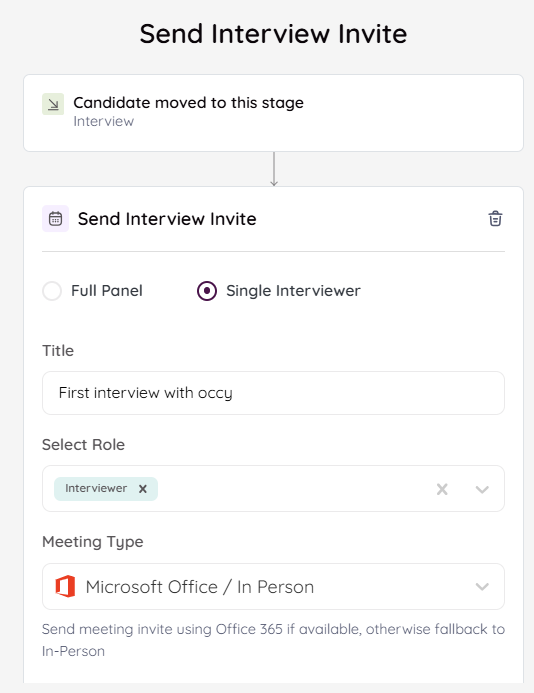 • Interview Scheduled - This condition allows you to use the Move to Stage action. Select which stage the candidate should be moved to from the dropdown once they have scheduled an interview.
