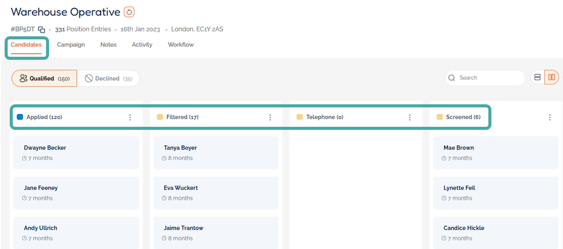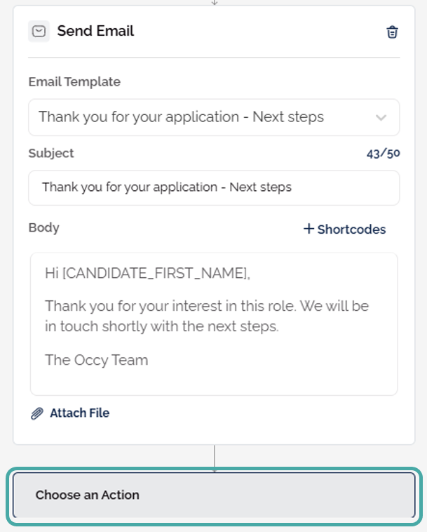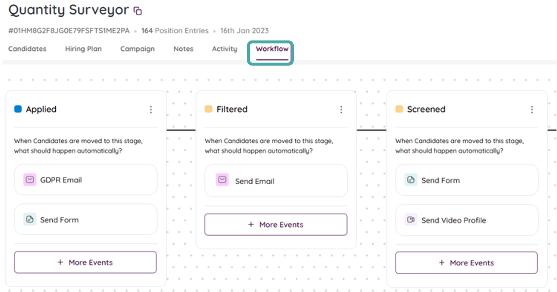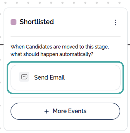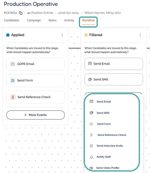 In the Workflow tab of a job, the stages can be customised with automated events that are actioned for each candidate placed into the stage.