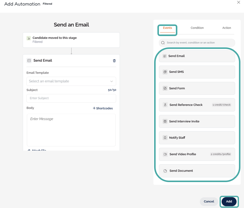 Essential tasks such as sending personalised emails, interview invites, forms, or documents and notifying staff can be added as events to specific stages (such as screened, hired, etc.) within a job workflow to execute automatically once a candidate moves into the stage.
