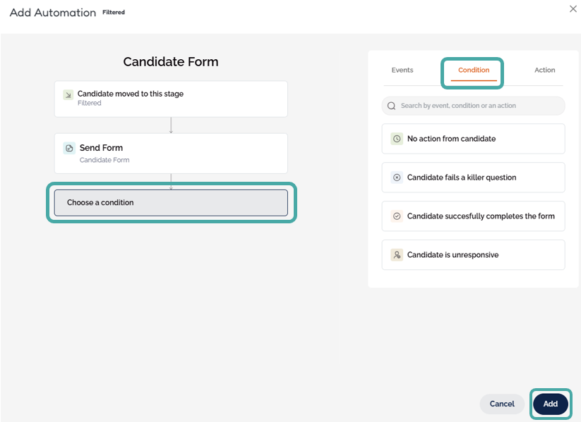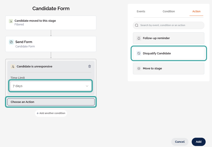Users can also set up additional automated actions to occur if a specific condition is met. For example, if a candidate fails to complete a form or select an interview invite, the additional options Disqualify Candidate, Move to Stage or Follow Up Reminder can be actioned.