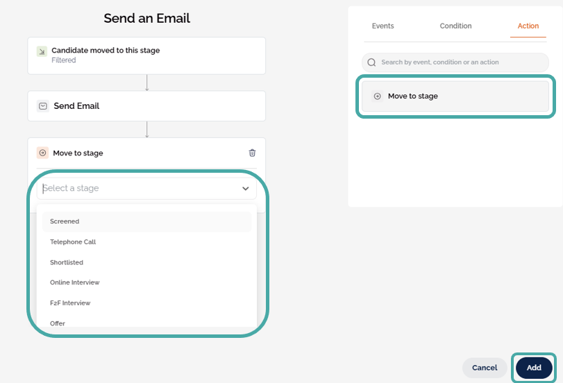 In the example below, the Send Email event has been chosen. After selecting the event, the following window will appear, outlining the event flow, starting with the candidate being moved into the stage and progressing to the chosen event.