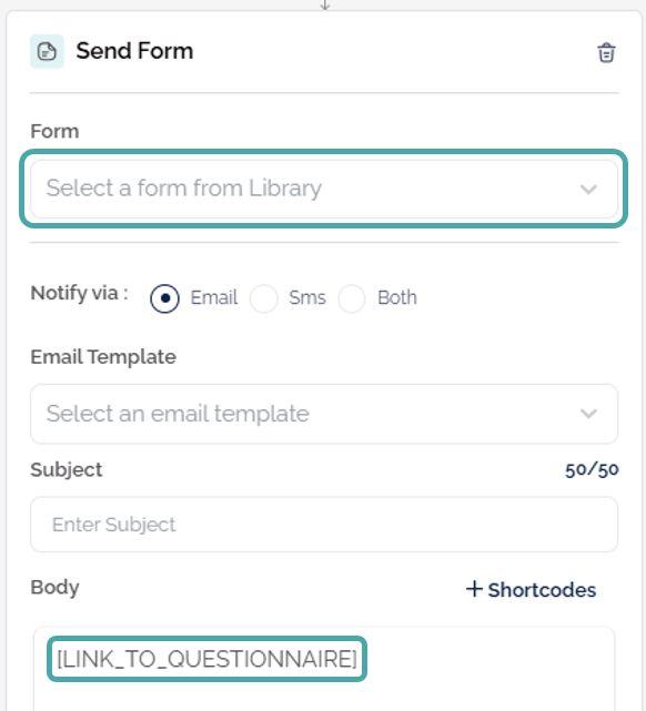 Note: The email or SMS message must contain the shortcode [LINK_TO_QUESTIONNAIRE] for the candidate to access the form.