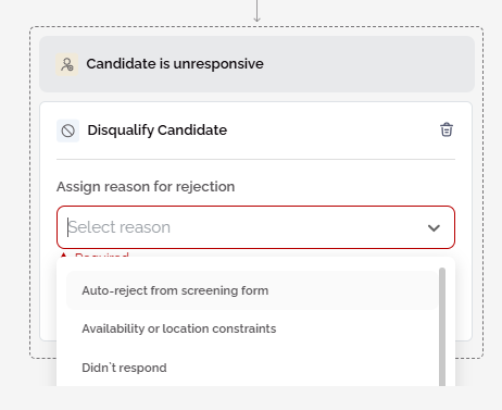 • Candidate Unresponsive - Select the Candidate is Unresponsive option, choose the number of days before the action takes place from the dropdown menu, and choose Disqualify Candidate from the Actions list. You will prompted to choose a reason for rejection from the dropdown menu. Reasons for rejection can be set in the Job Settings; follow Reasons for Rejection to find out more.