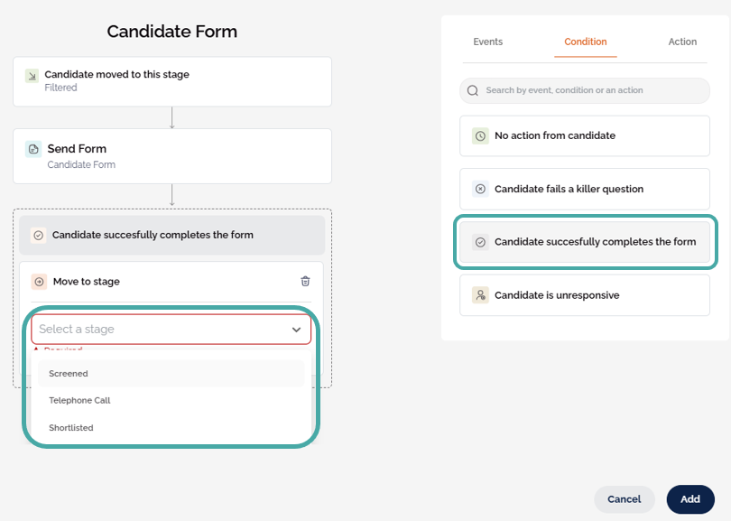 • Candidate Successfully Completed The Form - Choosing this condition allows you to select the Move to Stage action. Select which stage you would like the candidate to be moved into once they have completed the form.