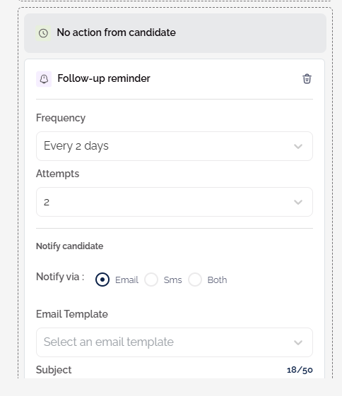 • No Action from Candidate - This condition allows you to send a follow-up reminder to the candidate. Select how often and how many times you would like to follow up with a candidate, and then choose the method in which to do so. Then, select an email or SMS template or complete the text boxes.