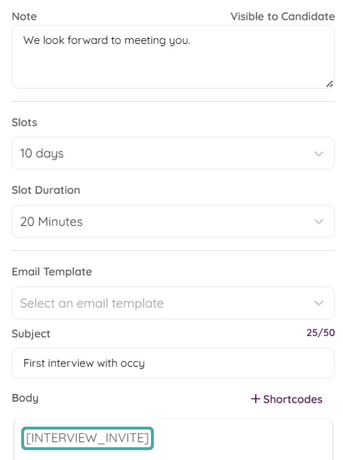 • Complete the interview invite fields, ensuring the [INTERVIEW_INVITE] shortcode is listed in the SMS or email message to allow candidates to select and confirm an interview slot. See the full process in the Creating an Interview Invite Automation section of this Scheduling Interviews article.