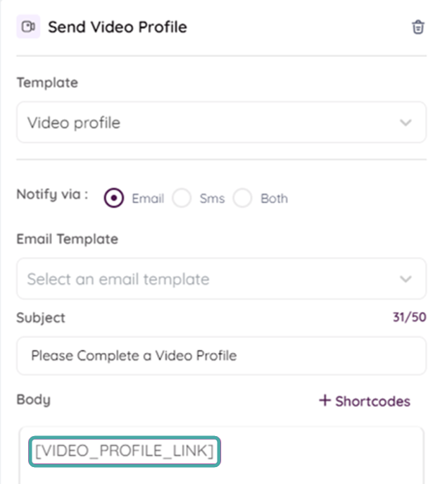 Note: Make sure to include the [VIDEO_PROFILE-LINK] shortcode to enable candidates to access the video profile software.