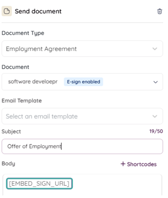 Note: Make sure to include the [EMBED_SIGN_URL] shortcode within the email to enable candidates to access the document.