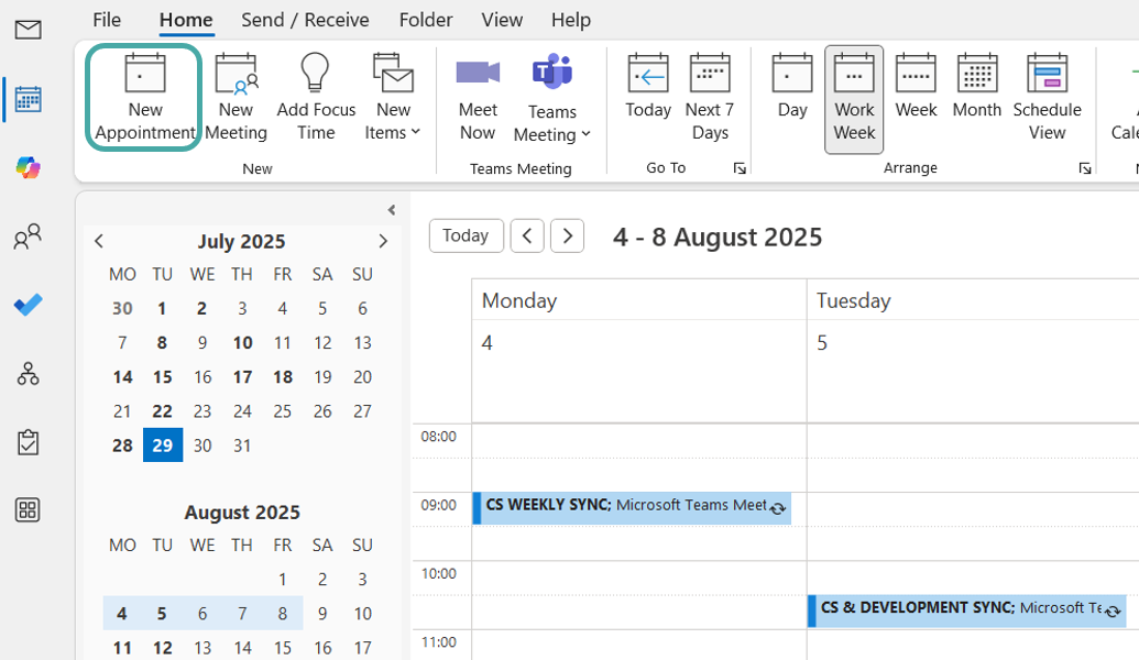 - Next, select New Appointment from the top of your Microsoft Outlook calendar.