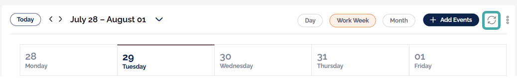 Note: If manually refreshing the calendar, the system will process the request once every 20 minutes. This means that if you refresh the calendar, and then refresh again after ten minutes, the second refresh request will not process until twenty minutes after the last successful calendar refresh.