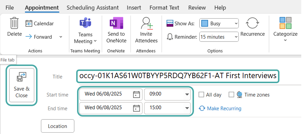 - To create a slot that can be recognised by occy, specific information must be added to the title. The format should be occy-job ID-reference text, for example, occy-01HZEKT9RMBAQM39FV3X8KPT5T-First Interview .