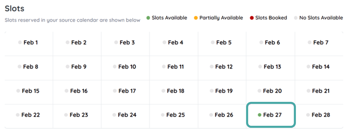 - Amber dots indicate days with partially-booked slots, for example, if a candidate has chosen a 30 minute interview slot from the 1-hour slot created in your calendar.