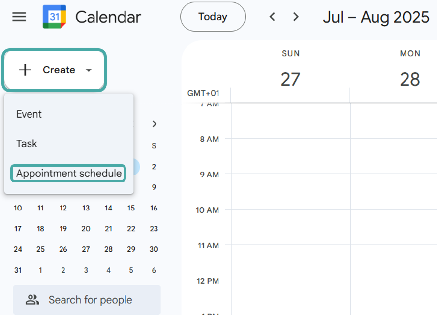 - Next, click Create and Appointment Schedule in your Google calendar.