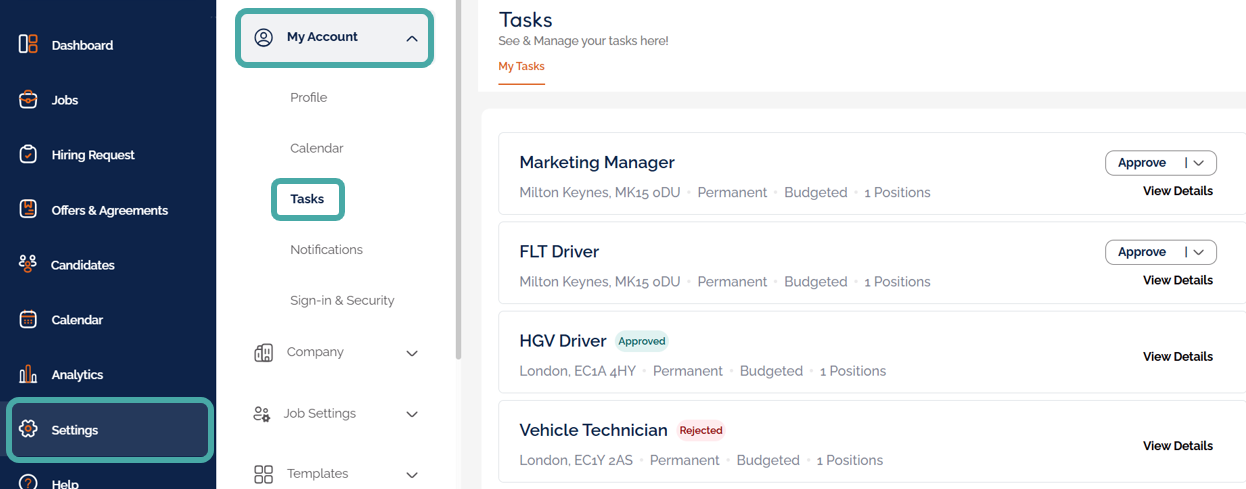 The Tasks section allows users to review and action pending tasks, all from one place. Tasks include accepting or rejecting hiring plans and upcoming scheduled candidate interviews.
