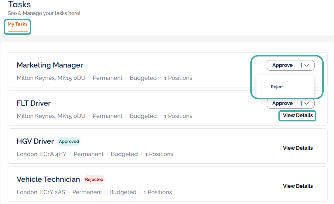 - Jobs which have already been reviewed and actioned will display an Approved or Rejected label.