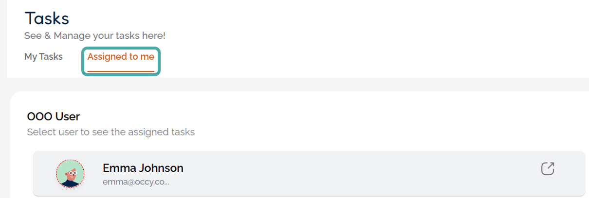 The Assigned to Me tab houses all tasks that need to be completed on behalf of another user. Here, you will see the user that tasks are being completed on behalf of, along with a list of tasks in the same format as the ones in the My Tasks tab.