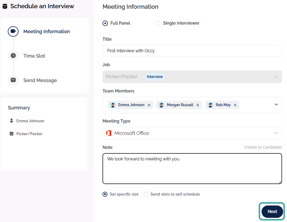 - Next, enter the updated interview details. Remember to select whether to send a specific slot or slots for the candidate to choose from. This form is the same as the one used to manually invite candidates to interview from the candidate profile.